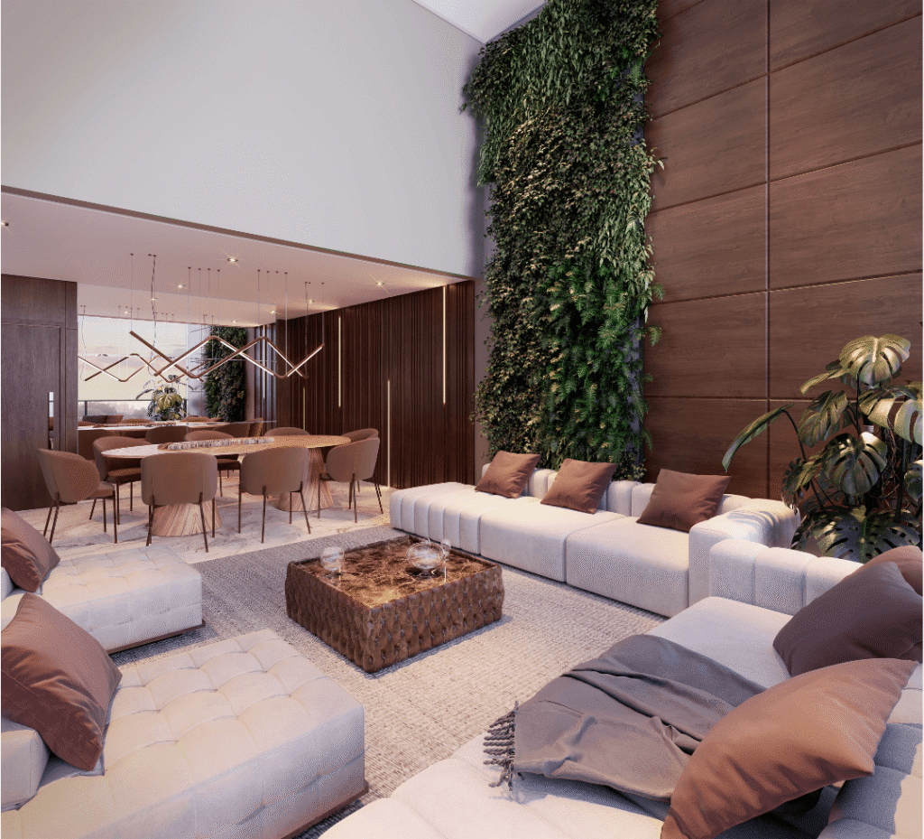 Amplitude que se sente no primeiro olhar. O pé-direito duplo amplia a percepção de espaço, traz mais luz natural e transforma a atmosfera do ambiente ao longo do dia.